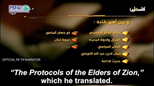 Now PA TV has again presented it not only as a true work but an “important book” in an educational PA TV filler about a Lebanese historian who translated it. The historian named Ajaj Nuwayhed, who PA TV describes as having made a deep “cultural and intellectual contribution,” was quoted in the introduction to the second edition of his translation of The Protocols from 1980, as follows: