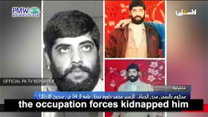Official PA TV reporter: “On Dec. 8, 1987, with the outbreak of the first Intifada when young Muhammad Daoud was beginning his path in life, the occupation forces kidnapped him to be a prisoner in their prisons (i.e., he was arrested and imprisoned for murder)…”