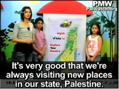 Official PA TV continues to teach children to envision a world in which Israel does not exist and all of Israel is instead part of the “State of Palestine.” The following lesson was on a new educational PA TV children’s program. The map used in the studio is named “Palestine” and includes all of Israel.Host: "Show me where you've been on the map of Palestine."