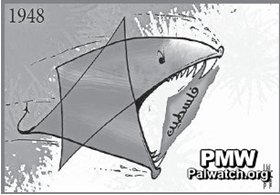 A shark in shape of the Star of David representing Israel is eating a map that includes all of Israel yet is marked as "Palestine."