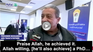 “The Fatah Movement’s Jenin branch, [PLO] Commission of Prisoners' Affairs, the [PA-funded] Prisoners’ Club, and the Martyr Abu Jihad Center at Abu Dis University… held a graduation ceremony for 38 prisoners in the Israeli occupation prison… [Manager] of Commission of Prisoners’ Affairs [in Jenin] Saif Abu Sayyaf said that 100 prisoners have completed their studies at Al-Quds Open University, 150 are continuing to study for a master’s and bachelor’s degree, four prisoners have completed their studies at An-Najah National University, and two prisoners at Kadoorie University.”