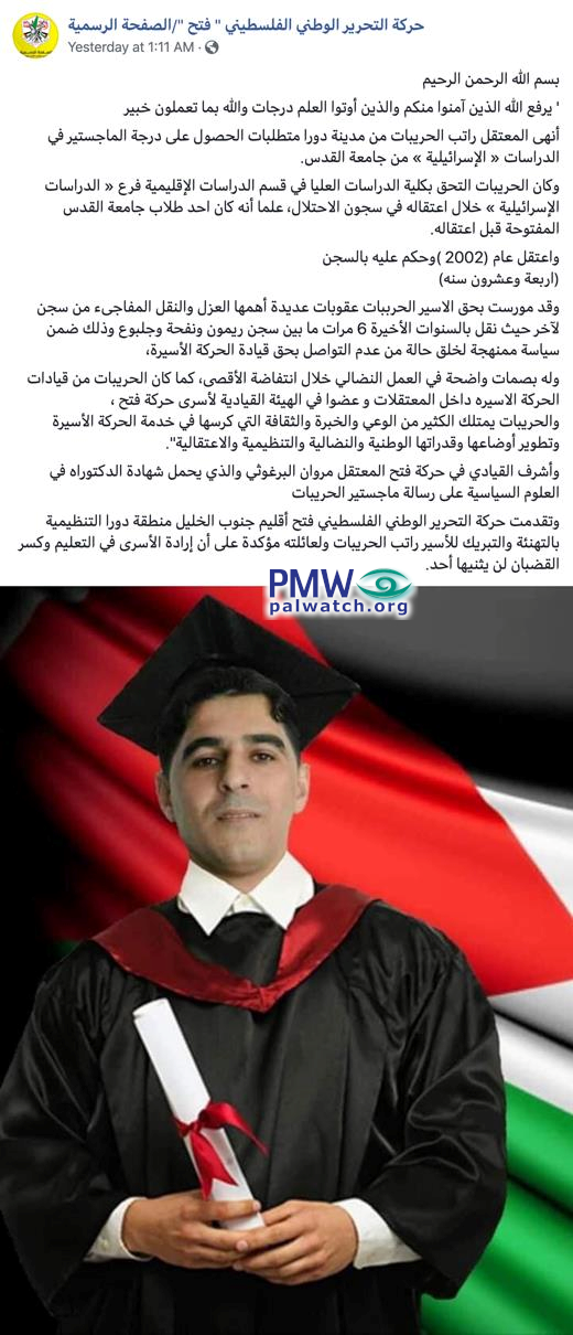 Fatah Movement leader prisoner Marwan Barghouti (i.e., terrorist, orchestrated three attacks in which 5 were murdered), who holds a doctorate in political science, supervised Al-Hreibat’s master’s degree thesis.”[Official Fatah Facebook page, May 22, 2020]