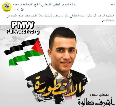 The PA uses the expression “self-sacrificing fighter,” (Fida’i) for terrorists who have been fighting and murdering Israelis since 1965, including the most loathsome murderers. For example, Palestinian terrorist Ashraf Na’alwa shot and murdered his 2 Israeli coworkers, Kim Levengrond-Yehezkel, a young mother of a one-year-old infant, and Ziv Hajbi, a young father of three. Fatah glorified the murderer repeatedly including this post on its official Facebook page, which called him: "The legend, the heroic self-sacrificing fighter (Fida’i) Ashraf Na'alwa" [Official Fatah Facebook page, Dec. 13, 2018]