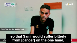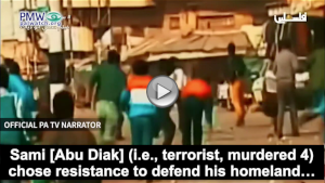 Official PA TV narrator: “Sami [Abu Diak] (i.e., terrorist, murdered 4)… chose resistance to defend his homeland… After 17 months in the Israeli prisons his body began to feel weak, and the prison guard allowed doctors to wreak havoc inside him, so that Sami would suffer bitterly from [cancer] on the one hand, and from the treatment on the other… The so-called [Israeli] prison authority arranged the causes [that would lead to] his murder and deliberately pushed him towards the beginning of the end. Sami is not unusual. He was preceded by hundreds of prisoners who were subjected to systematic and deliberate medical neglect [so Israel could] murder them.”