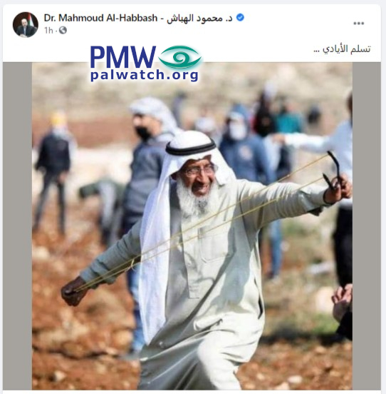 By posting the picture of the middle-aged Palestinian rock thrower above, PA Chairman Abbas’ advisor Mahmoud Al-Habbash encouraged this lethal means of “resistance” and added his praise too: