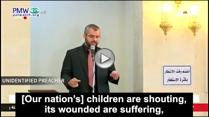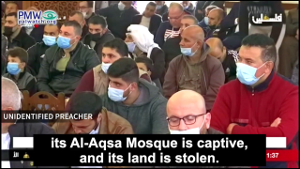 Unidentified preacher: “[Our nation’s] children are shouting, its wounded are suffering, its elderly are groaning, its mothers are crying, its Al-Aqsa Mosque is captive, and its land is stolen. But the situation of humiliation will not last, and Palestine will expel the invaders… [Israel] is a fake state that gathered the [Jewish] diaspora at the expense of scattering others [and] avenged its gas ovens by attacking a peaceful people.”