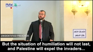A similar statement was made by an unidentified preacher in a sermon broadcast by official PA TV. The preacher claimed that Israelis are “invaders” who are “avenging the gas ovens by attacking a peaceful people.” He also vowed that these invaders will be “expelled”: