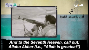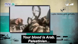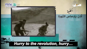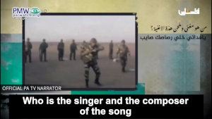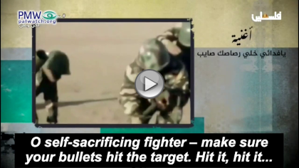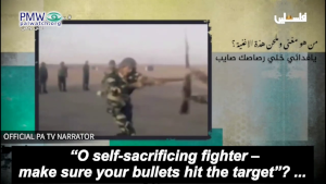 Another song of “value” presented in the PA TV quiz calls directly to the “self-sacrificing fighter” and instructs him to “make sure your bullets hit the target” and that “the [Israelis’] day does not emerge”: