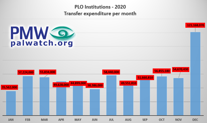 Fearing it would not be able to pay the terrorist prisoners their salaries in the coming months, on December 27, as PMW reported, the PA announced that it would pay the salaries of the terrorists not only for December, but also advance the payments for January and February of 2021. This is reflected in the spike of the transfer expenditure of the PLO institutions in December.