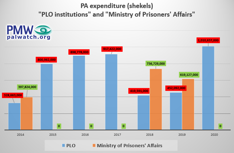 PMW concludes that the PA continued to pay salaries to terrorist prisoners in 2020; that the PA hid the salaries under the budget line of the “PLO institutions”; and that the total payments in 2020 to terrorist prisoners and released prisoners were at least 600 million shekels ($181 million).