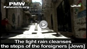 The description of the winter weather as being responsible for cleaning Jerusalem of the filth of Israelis/Jews echoes a similar PA statement a decade ago. Back then, Palestinian Media Watch exposed the PA’s antisemitic portrayal of Jews walking in Jerusalem as something “impure,” which it was the rain’s job to cleanse so that the feet [of Muslims] in prayer will not step on impurity":