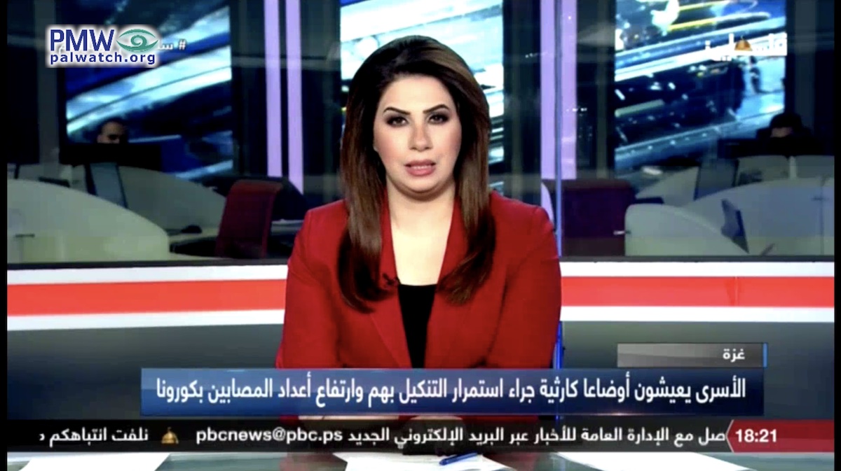 Text on screen:“The prisoners are experiencing disastrous situations as a result of the ongoing abuse of them and the rise in the number of Coronavirus patients (sic., see note below regarding the PA libel on medical abuse of Palestinian prisoners)”