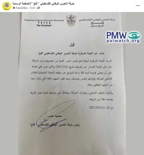 Excerpt from Abbas’ decision: “The Fatah Central Committee has decided to expel Nasser Al-Qidwa from the committee and from Fatah, in accordance with its decision that was made in the meeting on March 8, 2021…[Al-Qidwa] will be given 48 hours to retract his declared positions, which transgress Fatah’s regulations and decisions, and which harm its unity – and if not, he will be expelled…In accordance with Fatah’s regulations and decisions, and to preserve its unity, it views its decision as valid as of today.