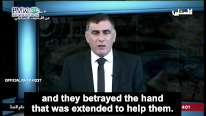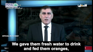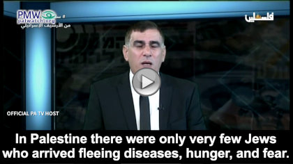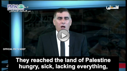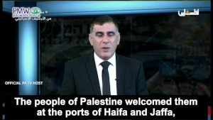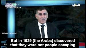 Official PA TV host: “In Palestine there were only very few Jews who arrived fleeing diseases, hunger, and fear. The people of Palestine welcomed them at the ports of Haifa and Jaffa, and they began to live here. But in 1929 [the Arabs] discovered that they were not people escaping who wanted to find refuge among the Palestinian people, but rather they are a colonialist project that wants to kill the Palestinians.”