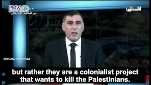 Later in the PA TV program, the host jumps back in time to the Jewish immigration to Palestine in the1920s again claiming falsely that Jews were welcomed. This likewise is a distortion of events as even at that time Jews in pre-state Israel were subjected to ongoing waves of Arab violence, and Jewish immigrants were not welcomed by the local population. The additional libel is the false assertion that Jews were coming as part of a “colonial project” and with the goal “to kill the Palestinians.”
