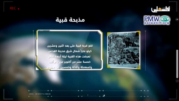 Official PA TV Narrator: "On the night between the14th and 15th of October 1953, the village of Qibya was subjected to a savage massacre that was committed by units of the Israeli army (refers to counter-terror operation; see note below –Ed.)."