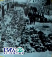 Palestinian Authority shows photo of dead Jews in Buchenwald concentration camp, and claimsit is “the village of Qibya, subjected to a savage massacre committed by units of the Israeli army”