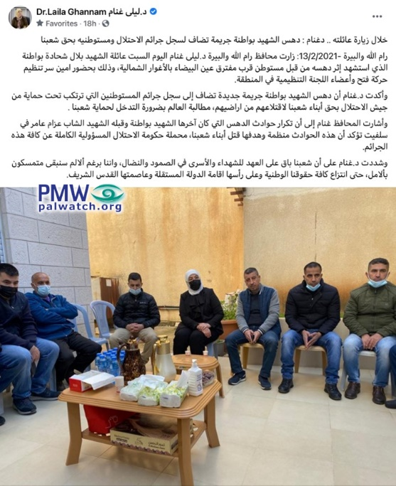 Today, Saturday [Feb. 13, 2021], Ramallah and El-Bireh District Governor Dr. Laila Ghannam visited the family of Martyr Bilal Shehadeh Bawatneh, who died as a Martyr after he was run over by a settler adjacent to the Ein Al-Bayda checkpoint in the northern Jordan Valley…