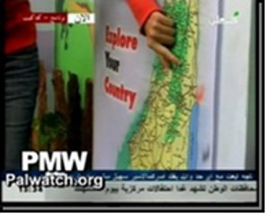 Every episode of the PA TV children's program "Chicks" includes a few moments devoted to teaching children about places in "Palestine." The map used by PA TV for this purpose is named "Palestine," and includes Israel as well as the Palestinian areas. Additional text on the map in English reads: "Explore your country;" and in Arabic: "My country is beautiful."