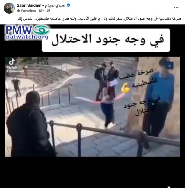 Sabri Saidam, a Fatah Revolutionary Council Deputy Secretary and Mahmoud Abbas’ advisor also turned to Facebook posting a video of an elderly Arab woman shouting at Israeli border police officers: “A Jerusalem shout in the face of the occupation’s soldiers: ‘Shut your mouth, you insolent one! This is the capital of Palestine! Jerusalem is ours!’”