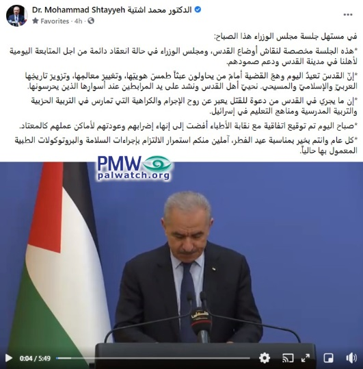 The [Jewish] calls to murder in Jerusalem express the spirit of crime and hatred in the partisan education in Israel, in the education in the schools, and in their curricula.”[Facebook page of PA Prime Minister Muhammad Shtayyeh, May 10, 2021]