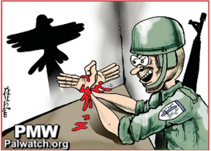 Palestinian Authority daily cartoon: Israeli soldier with blood on his hands creates shadow of dove on wall
