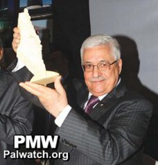 During a visit to Bethlehem, Palestinian Authority Chairman Mahmoud Abbas held up a stone model of the map of "Palestine" that erases Israel. The official PA daily described it as follows: