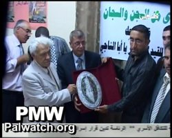 2. PA Minister of Prisoners Karake presents award of honor to prisoner's family in shape of "Palestine."