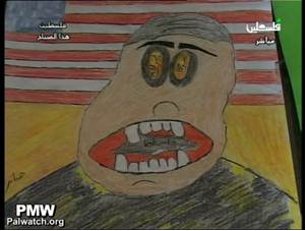 PA TV program Palestine This Morning shows a drawing by a girl who writes poetry and draws caricatures. The drawing shows a frightening face devouring a map of “Palestine” that erases all of Israel. The right eye says “America”, the left eye “Israel”.PA TV reporter: “Hatred for the settlers and the settlements is deeply rooted in the memory of [the girl] Hanan Ziyada.”