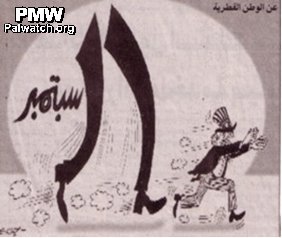 Uncle Sam chased by 9-11Al-Hayat Al-Jadida, official PA daily |Sep 11, 2002A fearful Uncle Sam running away in terror, being chased by the date "September 11." Text: "September" followed by legs that form "11" Note: This cartoon was originally printed in Al-Wattan (Kuwait) and reprinted in Al-Hayat Al-Jadida (Fatah).