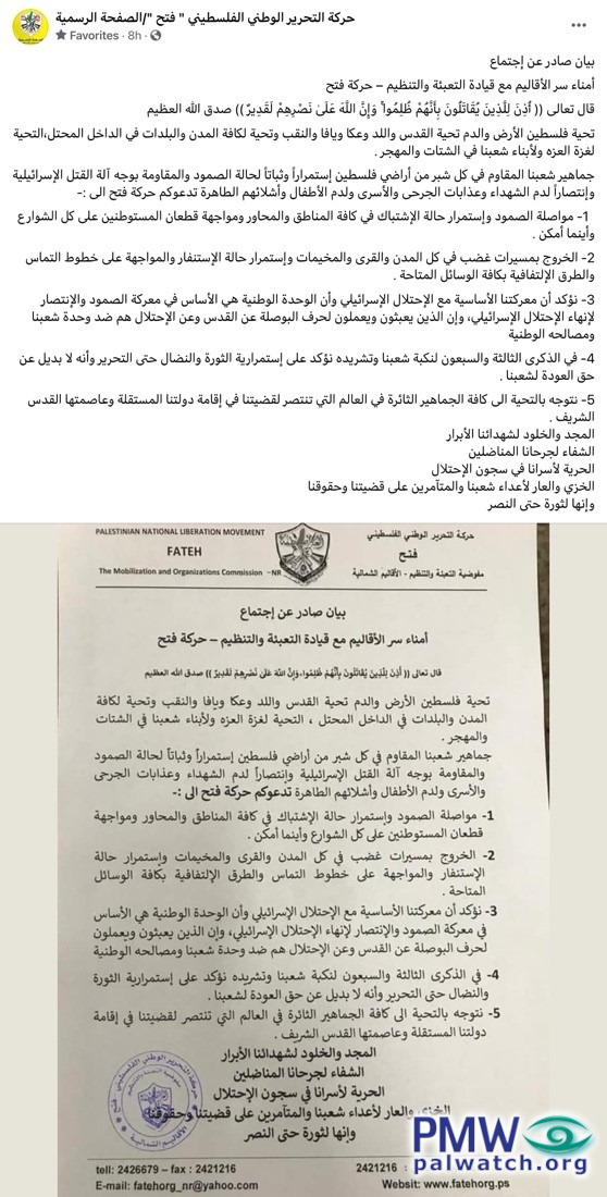 Posted text: “A statement issued by the gathering of [Fatah] branch secretaries with the leadership of the Fatah Movement Mobilization and Organization [Commission]