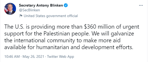 United States Secretary of State Antony Blinken announced yesterday on his Twitter account that “The U.S. is providing more than $360 million of urgent support for the Palestinian people. We will galvanize the international community to make more aid available for humanitarian and development efforts.” [Twitter, May 26, 2021]