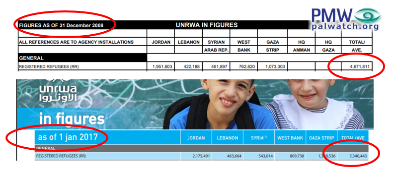 The continuous growth in the number of Palestinian refugees is due to the “refugee” definition that is unique to UNRWA, that allows for the “descendants of Palestine refugee males, including adopted children” to be registered as refugees, ad infinitum.