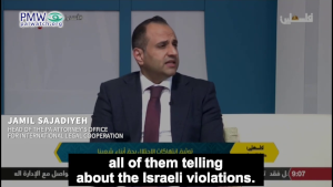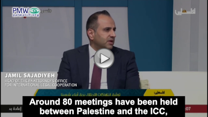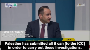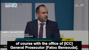 Palestinian Media Watch can now report that this week, the Head of the PA Attorney’s Office for International Legal Cooperation Jamil Sajadiyeh admitted that the PA, ignoring the above US condition, is very actively supporting investigations against Israelis at the ICC: