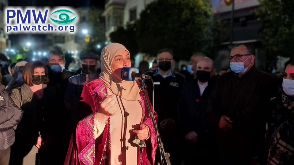 The images show Ramallah and El-Bireh District Governor Laila Ghannam speaking at an event for the Muslim fasting month of Ramadan at “Martyr Yasser Arafat Square” in Ramallah.