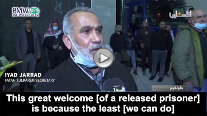 It seems the Palestinian Authority and the ruling Fatah party cannot say it enough times: They are “proud” of terrorist prisoners who attacked and/or murdered Israelis and view them as “a crown” on their heads. As Palestinian Media Watch has documented, this terror glorification is emphasized by the leadership repeatedly and again recently by Fatah’s secretary in Tulkarem: