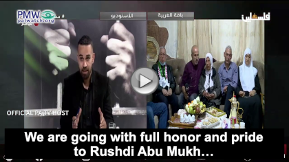 Official PA TV host: “We will be with one of the great ones of the homeland… the family of the prisoner who spent 35 years in the darkness of the prisons…that is prisoner Rushdi Saleh Abu Mukh (i.e., terrorist, involved in murder of 1)… We are going with full honor and pride to Rushdi Abu Mukh…“