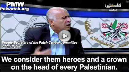 Senior Fatah official Jibril Rajoub also used the term “crown on our heads” to describe murderers who killed Israelis during the wave of terror attacks in 2015-2016: