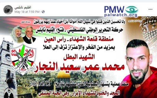 The image shows a picture of terrorist Muhammad Al-Najjar, who shot and wounded 2 Israeli soldiers near Havat Gilad, west of Nablus, on May 12, 2021, before being shot and killed by them. In the upper left corner are pictures of former PLO and PA Chairman Yasser Arafat and PA Chairman Mahmoud Abbas. Underneath them is the Fatah logo that includes a grenade, crossed rifles, and the PA map of “Palestine” that presents all of Israel together with the PA areas as “Palestine.”