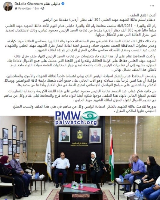Posted text: “Ramallah and El-Bireh District Governor Dr. Laila Ghannam gave the family of Martyr Muhannad Halabi (i.e., terrorist, murdered 2) a sum of 30,000 Jordanian dinars (over $42,000 -Ed.) today, Sunday [June 6, 2021], which was provided by His Honor [PA] President Mahmoud Abbas, in order to complete the amount needed to purchase the home of the family, whose home the occupation destroyed. This was during a meeting that District Governor Ghannam held in the presence of the Martyr’s parents and the family’s lawyer…