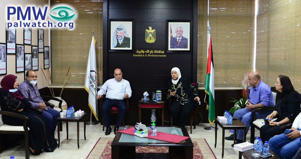 Posted text: “Ramallah and El-Bireh District Governor Dr. Laila Ghannam gave the family of Martyr Muhannad Halabi (i.e., terrorist, murdered 2) a sum of 30,000 Jordanian dinars (over $42,000 -Ed.) today, Sunday [June 6, 2021], which was provided by His Honor President Mahmoud Abbas, in order to complete the amount needed to purchase the home of the family, whose home the occupation destroyed. This was during a meeting that District Governor Ghannam held in the presence of the Martyr’s parents and the family’s lawyer…