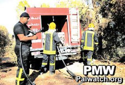"Un officier de la Défense civile palestinienne a affirmé avoir supervisé hier une équipe de 20 personnes, pour éteindre le feu qui s’est déclenché dans la région du Carmel au nord d’Israël il y a quelques jours. L’officier, Ibrahim Ayesh, a affirmé à l’Agence France Presse dans une conversation téléphonique depuis la région du Carmel : ‘Nous travaillons encore à éteindre le feu, depuis 9 heures ce matin, et nous n’avons jamais rencontré de problèmes en tant que membres de la Défense civile [palestinienne] travaillant parmi les israéliens.’ Ayesh a affirmé, ‘Nous espérons participer avec les autres à l’extinction rapide du feu.’ Il est à noter que l’équipe palestinienne de la Défense civile palestinienne a participé hier, dès le matin, à la lutte contre l’incendie qui s’est déclenché dans la région du Carmel, près de Haïfa, il y a quatre jours… La personnalité officielle a affirmé que la participation de l’équipe palestinienne à l’extinction du feu en Israël a été entreprise sous les instructions du Président Mahmoud Abbas et du Premier ministre Salam Fayyad, étant donné qu’il s’agit d’un acte purement humanitaire. »