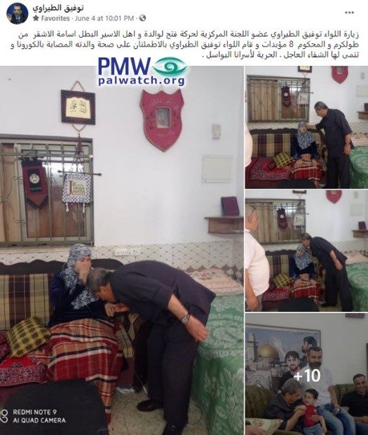 Posted text: “A visit by Fatah Movement Central Committee member [and Fatah Commissioner of Popular Organizations] Tawfiq Tirawi to the mother and family of heroic prisoner Osama Al-Ashqar (i.e., terrorist, responsible for murder of 8) from Tulkarem, who was sentenced to 8 life sentences. Tirawi took an interest in the health of the mother, who is sick with the Coronavirus, and wished her a speedy recovery. Freedom to our brave prisoners.”