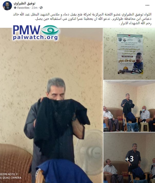 Posted text: “Fatah Movement Central Committee member [and Fatah Commissioner of Popular Organizations] Tawfiq Tirawi kisses the blood and clothes of heroic Martyr Abdallah Khaled Daabas (i.e., terrorist, shot at Israeli security forces), a resident of the Tulkarem district. We pray to Allah that he will increase our days so we will welcome him when he arrives (i.e., when Israel returns his body).