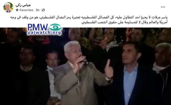 Fatah Central Committee member Abbas Zaki: “[Former PLO Chairman and PA President] Yasser Arafat [is the one] who told the Americans ‘no’ at Camp David, the one who stood firm in all the battles and said: ‘Millions of Martyrs are marching to Jerusalem.’ …Let none of you think that there is a Palestinian from his mother’s womb who could reduce Arafat’s value or harm him. Even if there are spies who are attempting to slander [the name] of someone who is better, more complete, and purer in struggle – that is another matter. We here in the town of Sa’ir, the town of the Martyrs, congratulate all the factions and forces. We are not alone. Fatah’s power is in that it accompanied all 13 Martyrs…