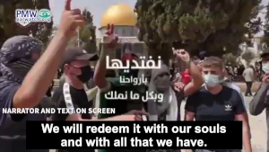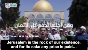 Narrator and text on screen: “We will come out as one line to defend our eternal capital [Jerusalem], and we will not allow our holy city to be harmed. Jerusalem is the rock of our existence, and for its sake any price is paid… We will redeem it with our souls and with all that we have. They will definitely not pass, as the men of Jerusalem are waiting for them.”