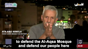 Fatah Jenin Branch Secretary Ata Abu Armila: “We in Fatah are calling on all the masses of our Palestinian people to head towards Jerusalem to defend the Al-Aqsa Mosque and defend our people here inside the mosque- inside Jerusalem, our eternal capital, in order to stand against this arrogance and against the growing oppression of the occupation against our Palestinian people…