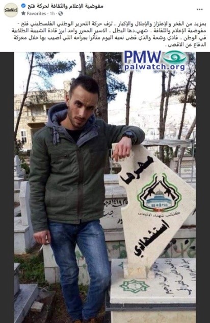 Accordingly, Fatah announced “with great honor, pride, and admiration,” that it accompanied to his “wedding,” a Palestinian “Martyr,” Fadi Washaha, who was shot during violent riots and confrontations with Israel. Fatah included a photo of a man standing by a gravestone with the inscription: “The bride price of [Palestine] is my death as a Martyr,” implying that if you want “Palestine” as your “bride,” then you must be prepared to seek death for “her”:
