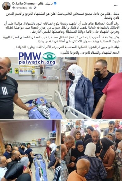 Posted text: “[Ramallah and El-Bireh District Governor] Dr. Laila Ghannam at the Palestinian Medical Complex, where it was announced that wounded released prisoner Fadi Washaha died as a Martyr (i.e., having been wounded while participating in violent Arab riots; see note below).