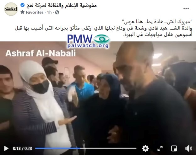 To strengthen its indoctrination of Palestinians to seek death as “Martyrs” for “Palestine,” and the “joy” relatives are supposed to be feeling when they “succeed,” Abbas’ Fatah movement also posted a video of the dead rioter’s mother “celebrating” his “wedding”: